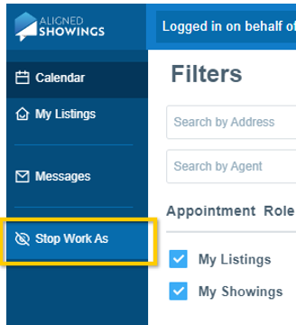 6. Click Stop Work As on the left to return to your Aligned Showings account.