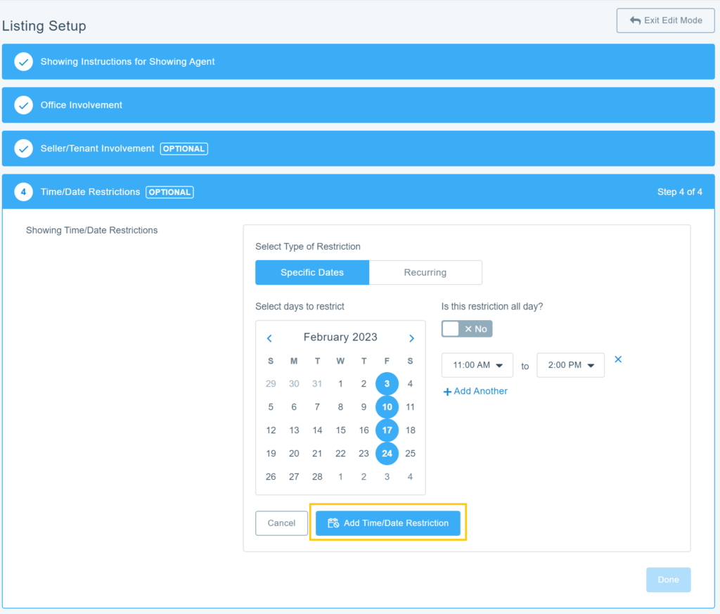 - Is This Restriction All Day?: This tool is used to designate whether the restriction applies to the entire day or only applies to certain hours during the day. You can block out one or more timeframes within a given day. For example, no showings on Fridays from 9:00 AM to 10:00 AM or from 5:00 PM to 6:00 PM.