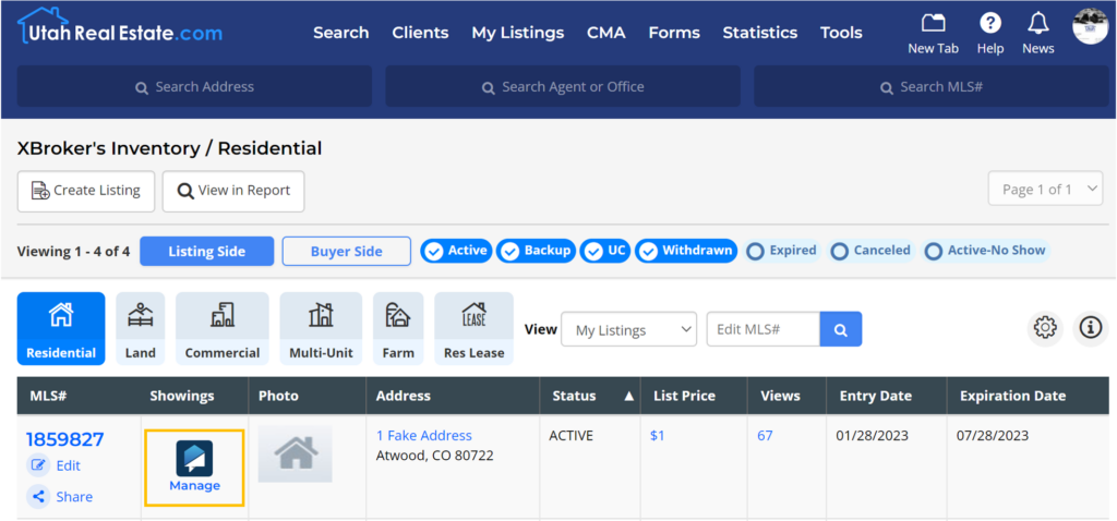 Click the Manage icon that appears next to your listing in the Showings column on the My Listing Inventory page.