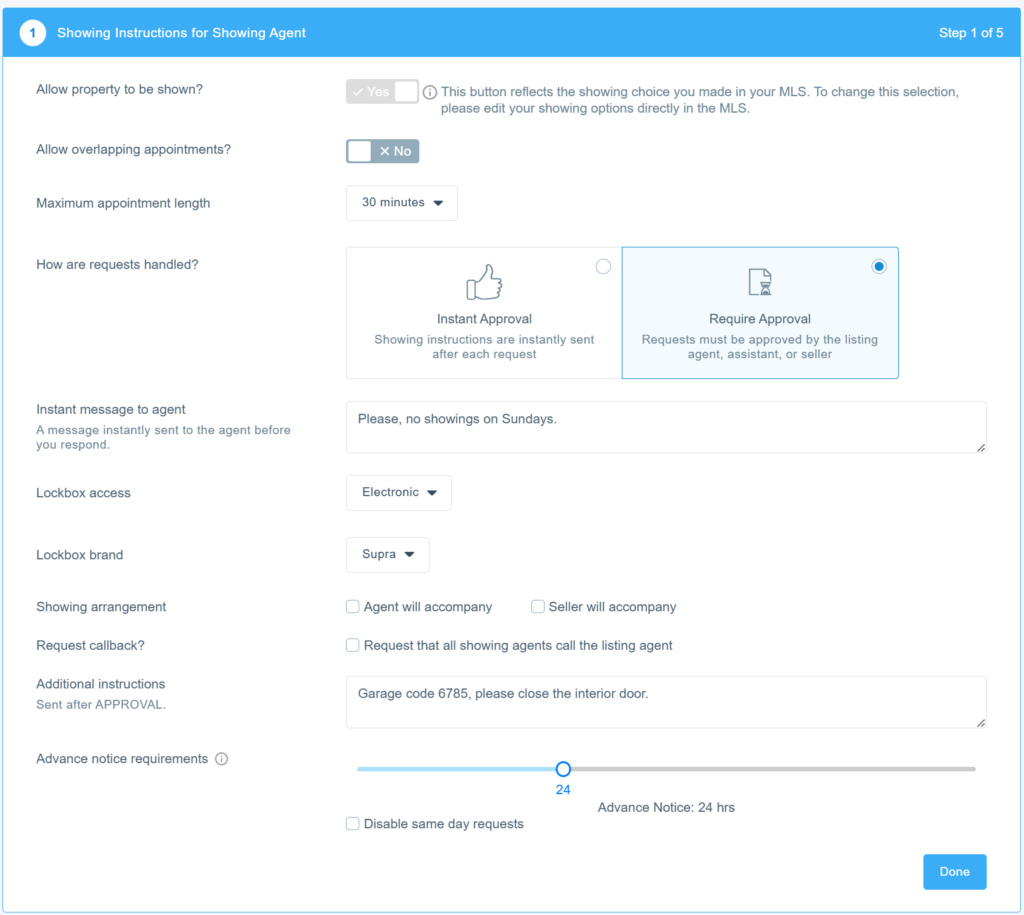 - Advance notice requirements: Specify if advanced notice is required for showings. Please note: if the “Disable same day requests” option is selected, the slider above will be disabled.