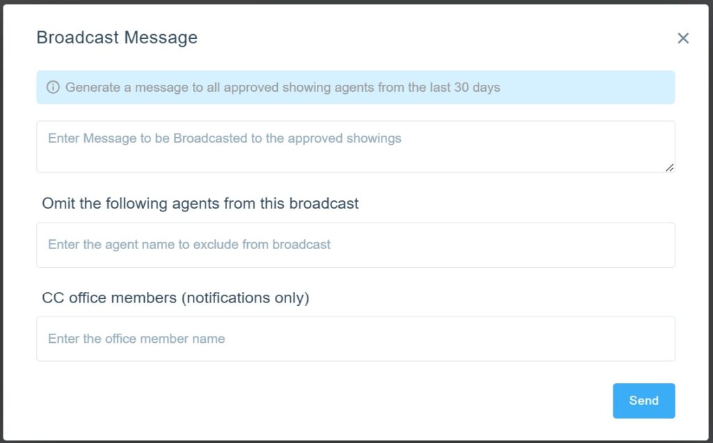 You may also choose to omit (exclude) specific showings agents from receiving the message. You may also include any people in your office that you would like to receive a copy of the message, such as your assistant or broker. Click Send to send the message.