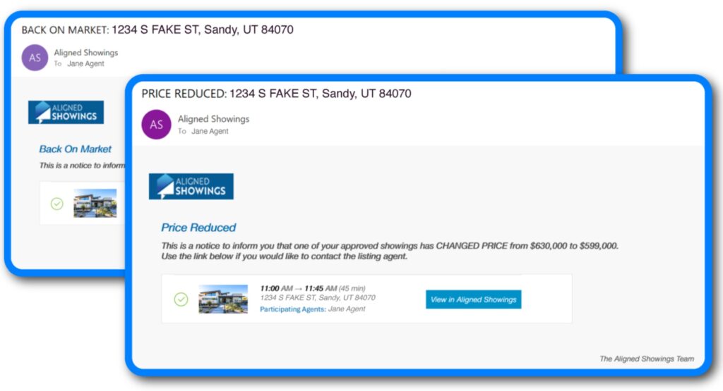 Aligned Showings: Notifications Sent to Showing Agents for Back On Market Listings, Price Reductions, Direct Broadcast Messages