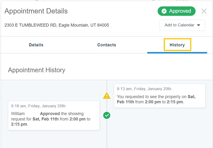 To view the history of a showing appointment, click on the event for the showing request on your calendar, and click on More Details. Then click on the History tab. Here you will see the history for that specific showing request, including the date and time the showing appointment was originally requested, when the appointment was confirmed or declined, and any other details for the history of that showing request.