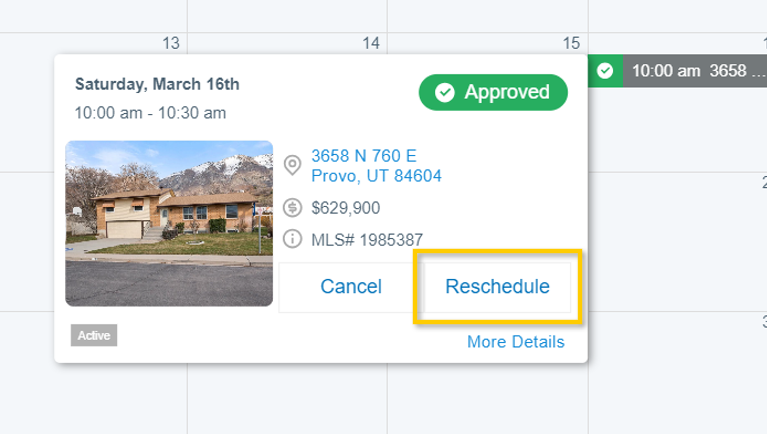 To change the date and/or time of a showing you have requested, click on the showing event on the calendar, and click on Reschedule. Use the module that appears to select a new date and time, then select Send to cancel the original appointment and send a request for the new date and time.