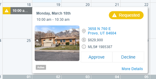 To view or act on the details of a showing event that appears on your calendar, simply click on that event from your calendar.