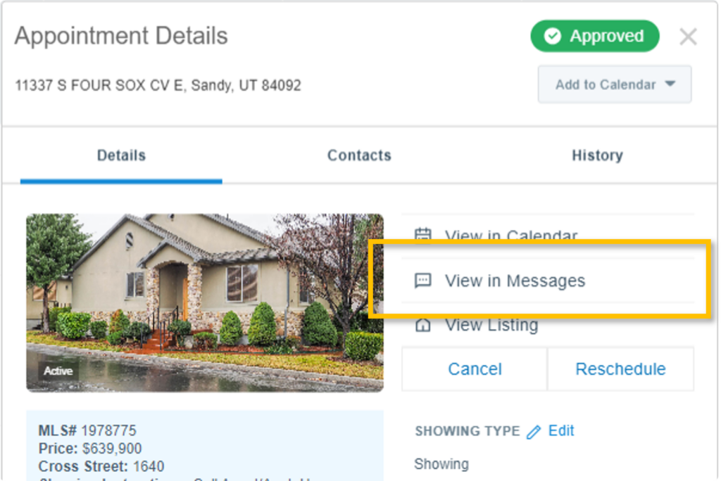 To access the messages thread for a specific showing appointment (a “message thread” in Aligned Showings is the communication history between the listing and showing side), click on the event for the showing request on your calendar, and click on More Details. On the right side of the page, click on View in Messages. You will be brought to the message thread for that specific showing. Click here to learn more about Messages.