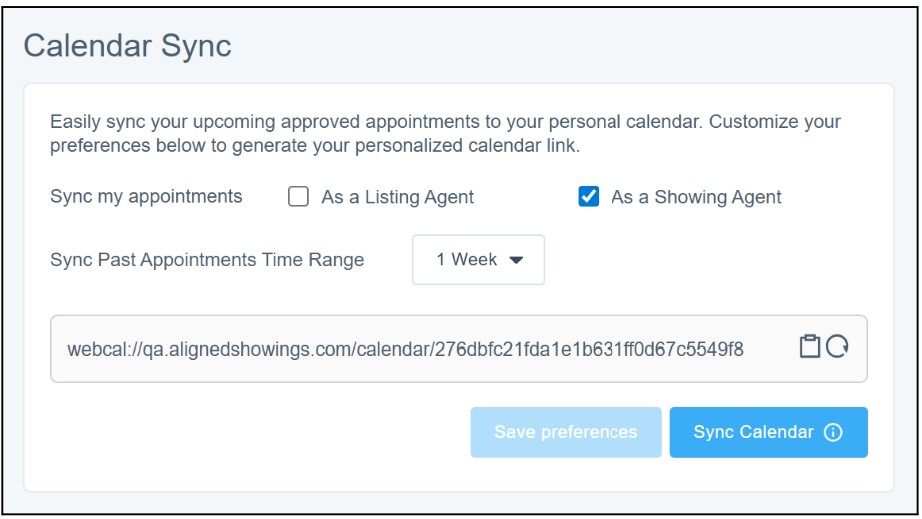 To create a calendar sync, first set it up in Aligned Showings. This new feature is under Settings > System > Calendar Sync. Select the type of appointments to sync, the time range for past appointments, and then generate the link. Select the icon to copy the link that you will paste into your preferred external calendar program.