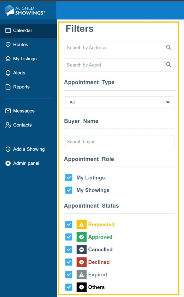 - Appointment Status: This filter is used to show/hide showing appointment requests based on the status of the request. Here are definitions of the different showing statuses: