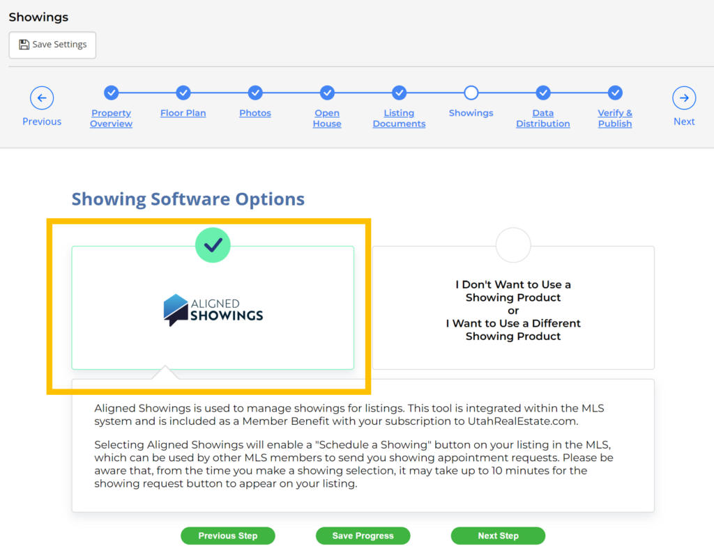 There is a step during Listing Input there called Showings, and this is where you can enable Aligned Showings for a listing. Simply click the Aligned Showings tile, as seen below, and Save.