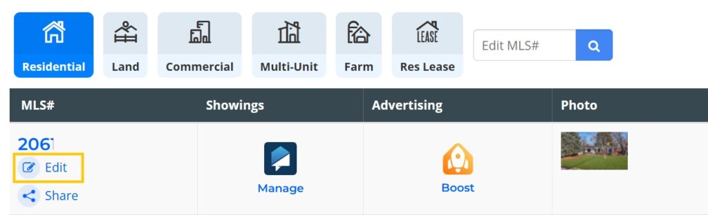 2. Click the Edit button next to your listing. Note: You must have listing input permissions in order to edit a listing. Please speak with your office if you do not have permissions to edit a listing.