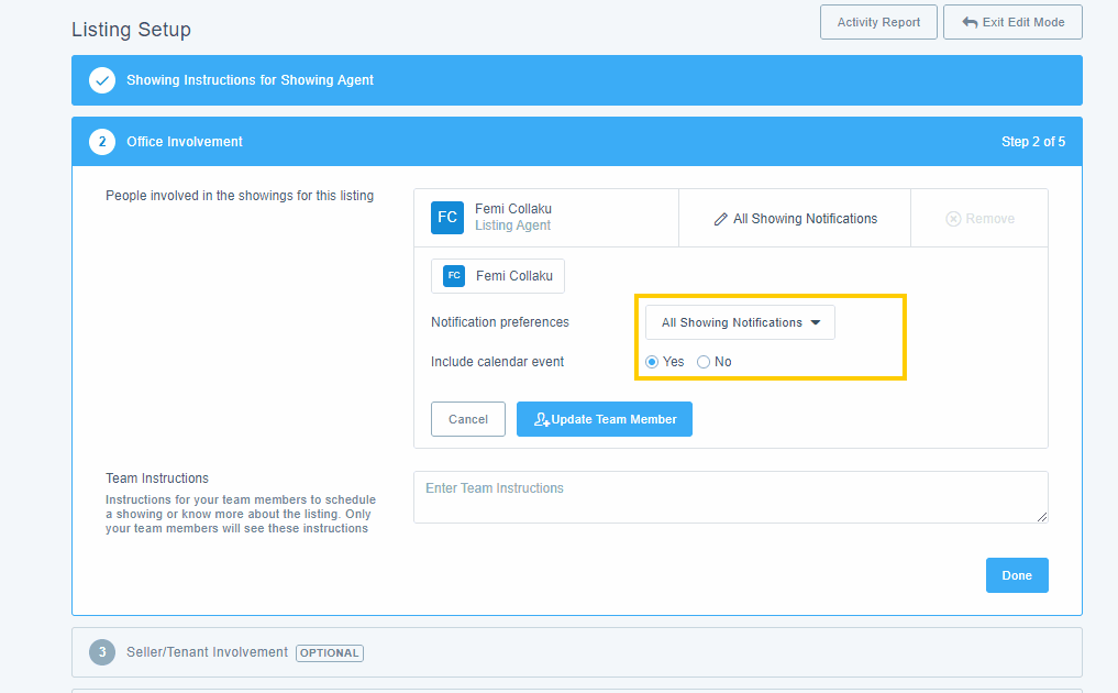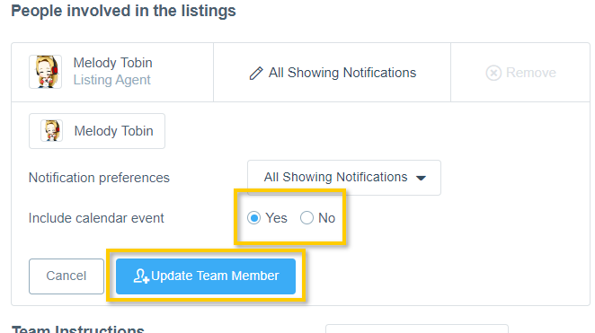 4. Select the preferred options for the Listing Team member. Include calendar event will control whether the team member receives a calendar event file (when they receive new showing notifications about this listing via email). Ensure the changes are implemented by selecting Update Team Member before navigating away.
