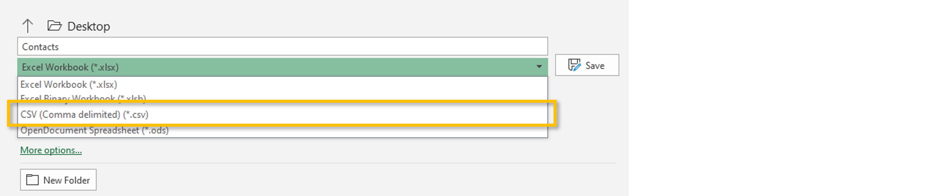 4. Finally, Save your file by clicking the Save As option. We recommend saving the file to your desktop. When saving, make sure the File Type you are saving is a CSV file type. This is commonly displayed as CVS (comma delimited) (*.csv) or CSV (comma delimited). You can use the File Type drop down to change the file type as needed.