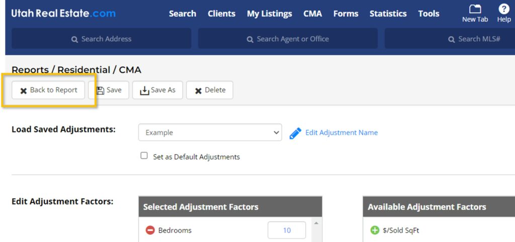 UtahRealEstate.com’s CMA Report tool enables users to save their own custom adjustment factors and corresponding values to use in CMAs. Save multiple CMA adjustment templates to use in the markets where you sell real estate. Additionally, you can choose which specific adjustment template you’d like to use as your default if you find yourself using the same template on a regular basis.