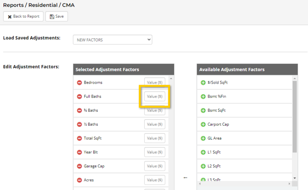 Step 3. As you add adjustment factors to your custom template, you will see a Value ($) field appear next to each adjustment factor, and that is where you can designate a specific dollar amount for each specific adjustment factor. These values will automatically apply whenever this custom CMA adjustments template is used moving forward.