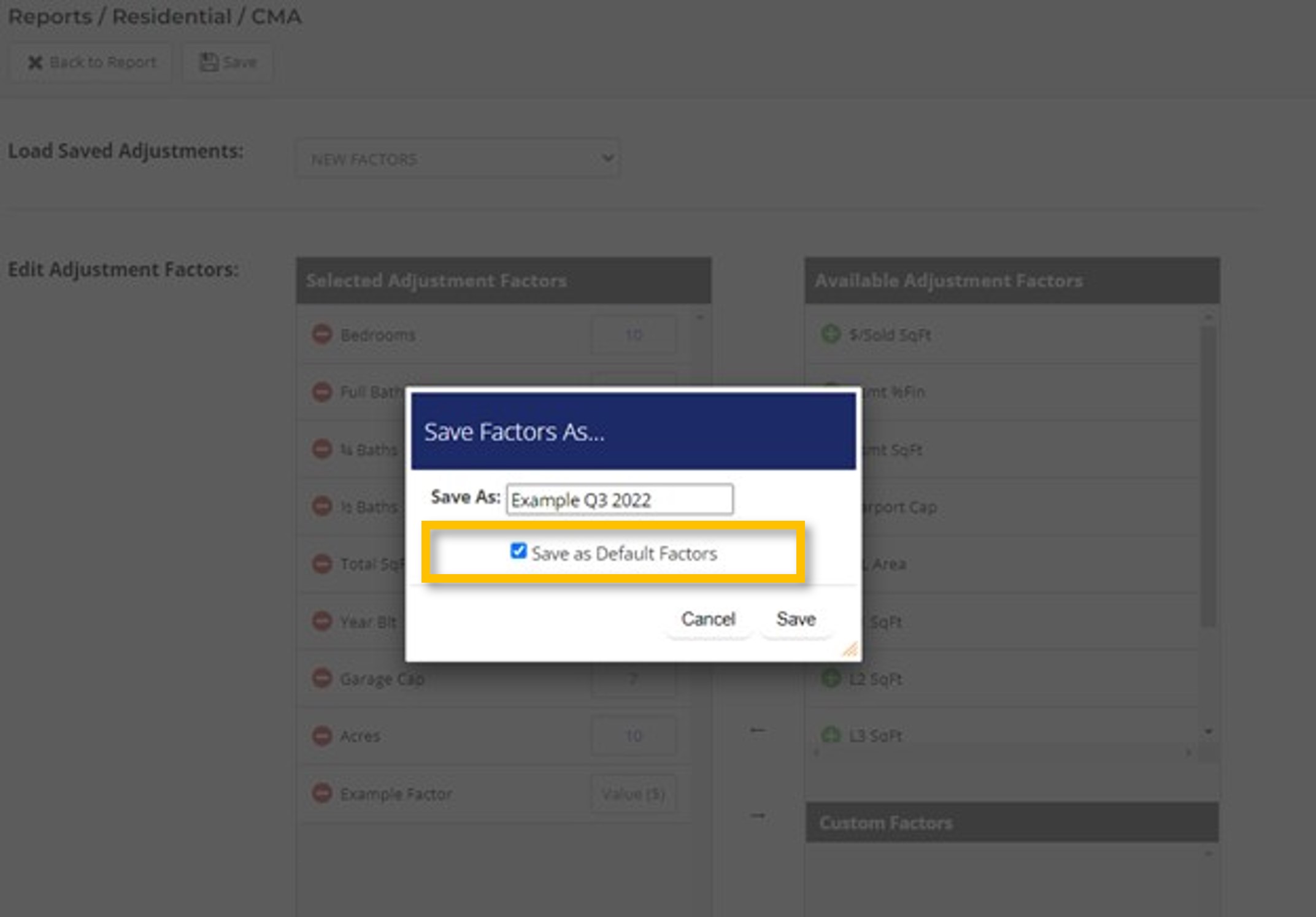 Step 4. Once you have created your custom template, select the Save option and enter a name for your template. When saving your template you will also see an option that says Save as Default Factors, which you can select if you want this specific adjustment template to be your default CMA adjustment template (i.e. this template will load automatically every time you go to create a new CMA report).