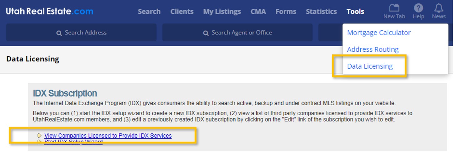 Note: To view a list of IDX vendors currently licensed with the MLS, open Data Licensing from the Tools tab of the MLS. Then select View Companies Licensed to Provide IDX Services.