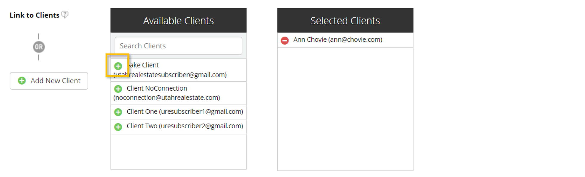 Once a Client Connection has been established, you will see the client[s] in the Available Clients section. Use the green plus sign to select Available Clients to receive the Listing Alert, or use the Add New Client option to add a new client and prompt the client to accept your Listing Alert emails.
