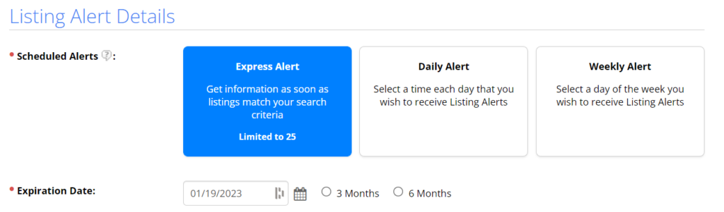 - Express Alert: An Express Listing Alert email will be sent as soon as a listing matching your search criteria is added to the MLS or is updated (i.e. Status Changes or Price Changes). Please note: The Express Listing Alert option is a newer feature which is currently limited to 25 Express Listing Alerts. This limit is the total number of Express Listing Alerts which can be actively running from any one individual MLS account. This limit does not impact the number of listings sent through the Listing Alert.