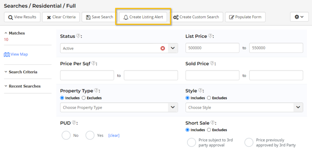 Step 1. Start by conducting a listing search in the MLS. Include only the criteria that is associated with the type of properties you are interested in receiving/sending information about. After you have established the search criteria you want to use as a basis for your Listing Alert, select the Create Listing Alert option.
