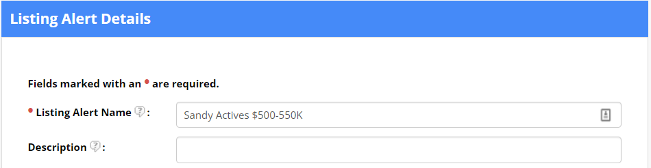 Step 2. On the Listing Alert Details page, start by creating a name for you Listing Alert. The name you assign will be the subject of the Listing Alert email (unless a different subject is entered under the Email Options section of the Listing Alert setup).
