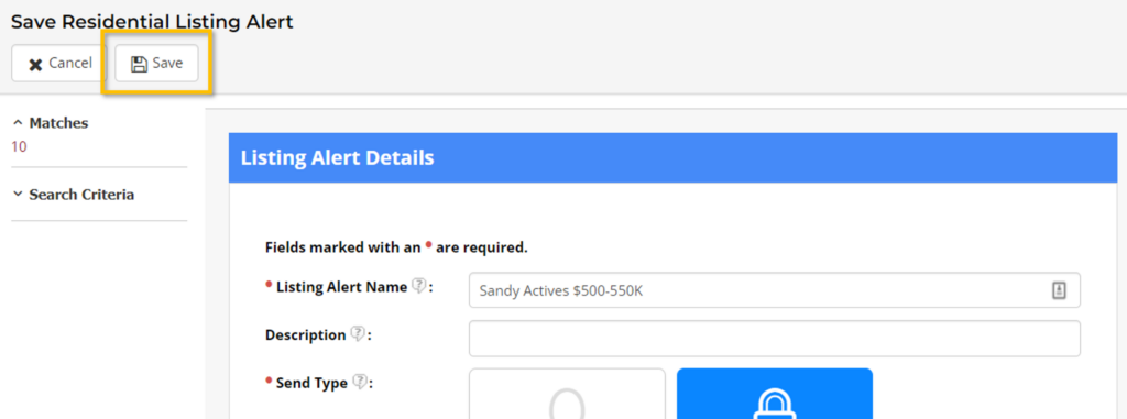Step 6. Last, click the Save option at the top of the screen to save your Listing Alert.
