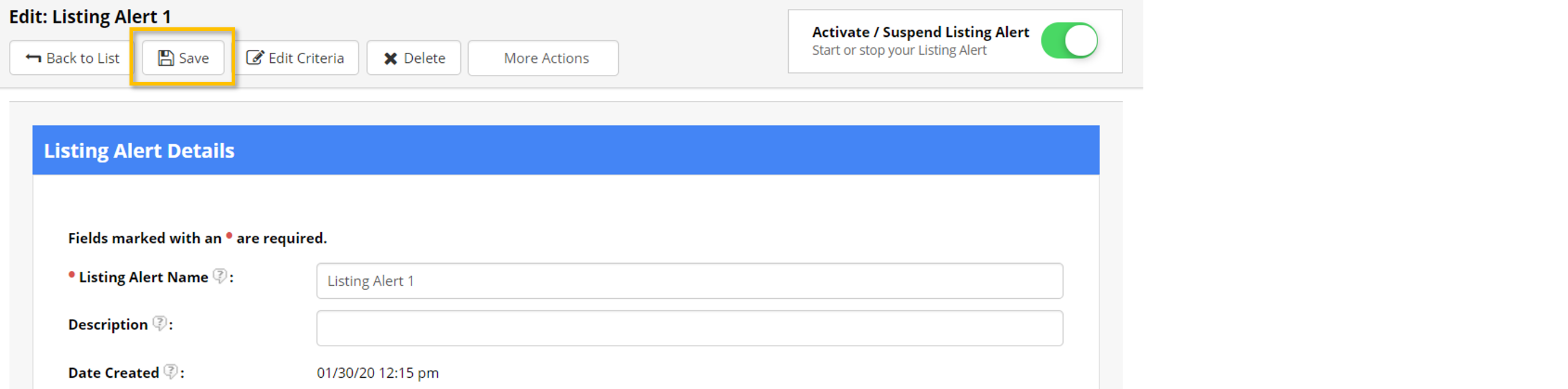 Tip: From the Listing Alerts overview page, you can quickly extend the expiration date of a Listing Alert by one year by toggling the Listing Alert off and then back on, using the “Off/On” button.