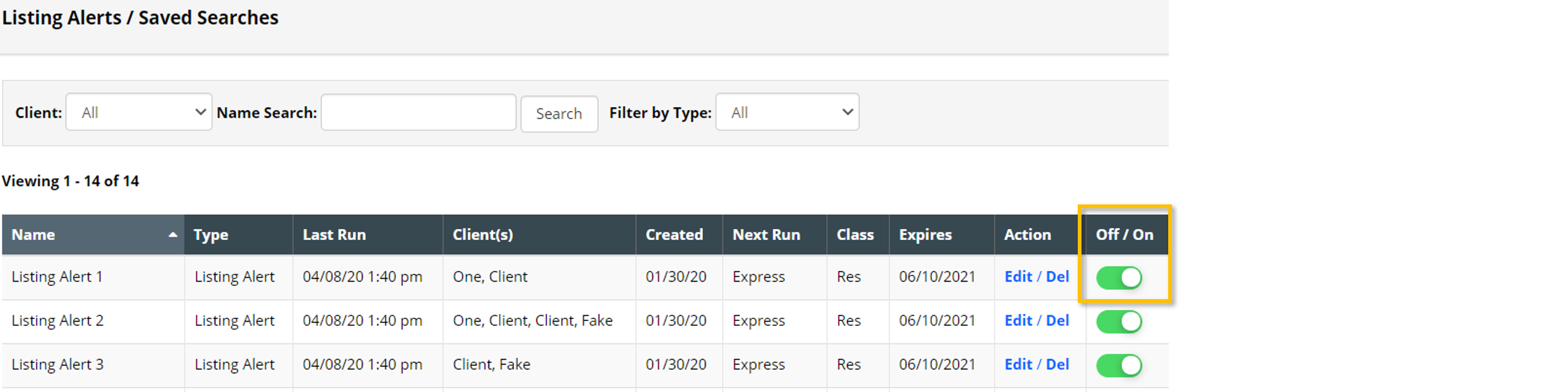 The quickest way to turn a Listing Alert off or on, is to use the “Off/On” toggle option that appears on the main Listing Alerts overview page, which shows all of your Listing Alerts in a grid view. Simply use the button that appears in the “Off/On” column to quickly turn a Listing Alert off or on. Please note that you can also sort using this column.
