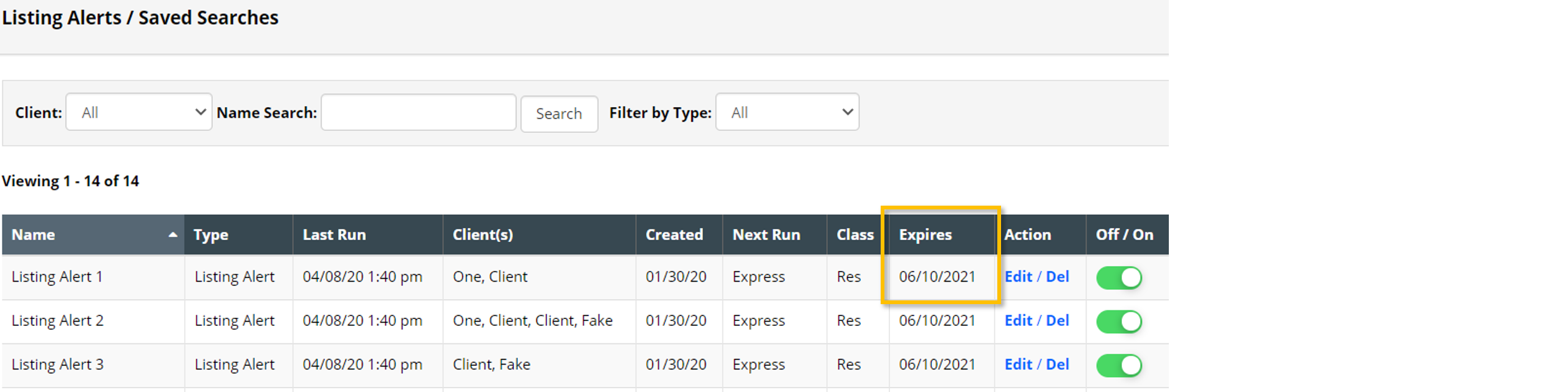 1. Visit the main Listing Alerts overview page by selecting Listing Alerts under the Clients tab. On this page there is an Expires column which shows the date each Listing Alert is set to expire. Please note that you can click the column header to sort by date created.