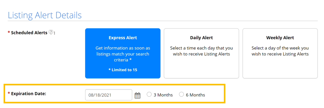3. Scroll down to Listing Alert Details and next to the Expiration Date field, use either the calendar tool or one of the 3 month or 6 month quick toggle options to set a new expiration date.