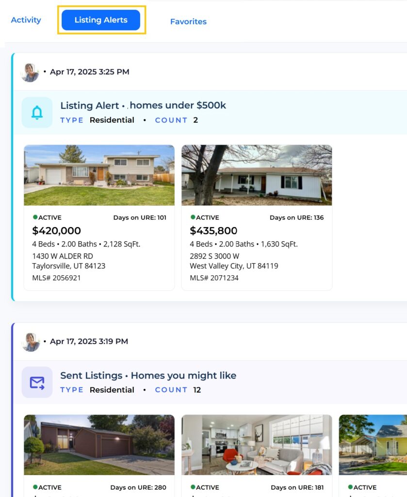 3. You will see the recent activity on the Activity page, including Listing Alerts (and directly sent listings) that you have sent to them. You will also see the listing alerts on the Listing Alert tab.