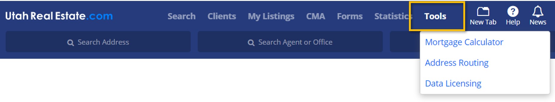 There are several ways to access the Mortgage Calculator. The Mortgage calculator can be found under the Tools tab in the MLS and under Mortgage Calculator on the public website. Additionally, the Mortgage Calculator can be opened by clicking on the price of a listing.