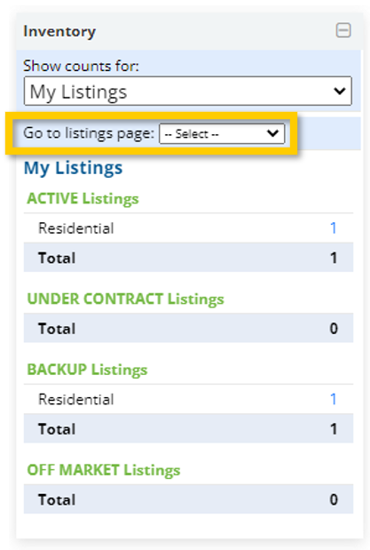 Agents can choose which property type they’re viewing in the widget under the “Go to listings Page” dropdown menu, or see the whole count across all property types by default.