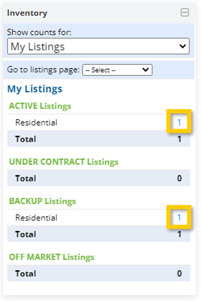 • The Inventory Widget shows counts of (and links to) your own listings. For brokers, this tool can be used to view total listing inventory for your entire brokerage or a specific office within your brokerage.