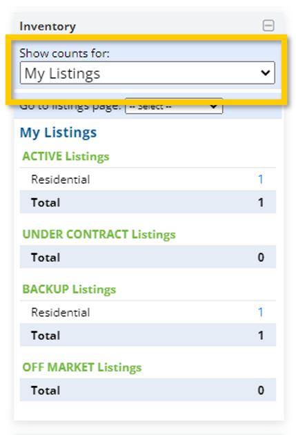 Brokers have an option to see their own listings, all listings in their company, or all listings within a given office in their company using the “Show counts For” dropdown menu.