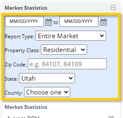 You can use the fields available in the blue section at the top of the Market Statistics widget to customize the statistics that appear based on a specific time period, market, property type, zip code(s), state, and/or county.