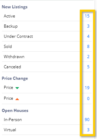 The blue numbers which represent the total number of listings in a given status can be clicked to open a report that shows all of those listings.