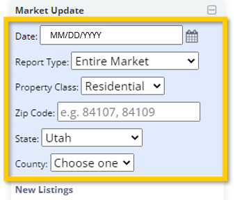 You can use the fields available in the blue section at the top of the Market Update widget to customize the statistics that appear based on a specific time period, market, property type, zip code(s), state, and/or county.