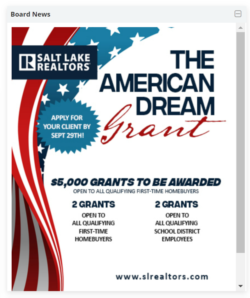 The Board News Widget contains content that is controlled and updated by your local association of REALTORS. The information included in this widget will relate to any associated-related news information. This widget appears based on your primary association membership affiliation.