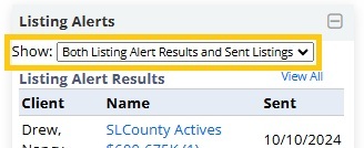 The Listing Alerts Widget will display the 10 most recent results from Listing Alerts that have been sent from a your account, as well as the 10 most recent Send Listings that were manually sent from the MLS system.