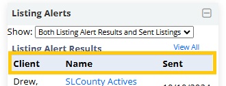 The information shown includes the Client associated, the Name of the Listing Alert (or subject of the Sent Listings), and the Date Sent.