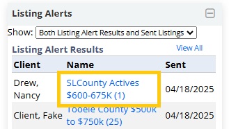 • The Listing Alerts Widget will display the 10 most recent results from Listing Alerts that have been sent from your account, as well as the 10 most recent Sent Listings you have manually sent from the MLS system.