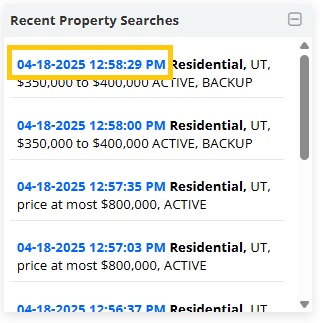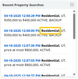 • The Recent Property Searches Widget displays your last 10 searches while logged in to the MLS. You can click a recent search to re-run that search.