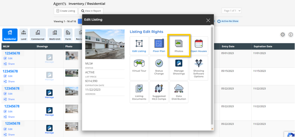 Photos can be added to a listing during initial listing input or by editing an existing listing and choosing the Photos edit option.