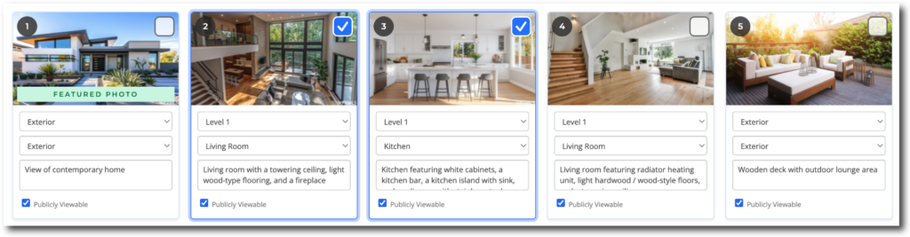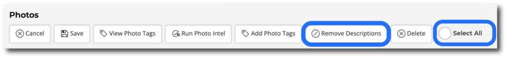 To clear all listing descriptions, click the “Select All” checkbox found on the right side of the Action Toolbar. Once all photos are selected, click the “Remove Descriptions” button at the top of the page.