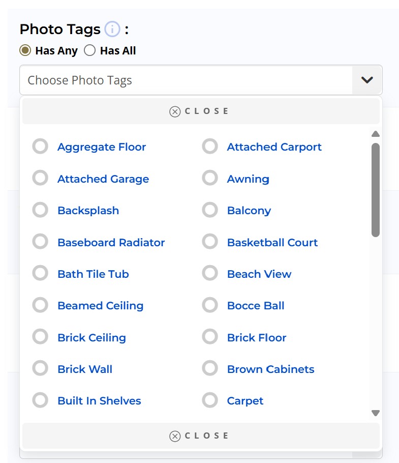 The Photo Search page works identical to the other search pages available in the MLS, however, you will see a new search field called Photo Tags. This search field is where you can specify the photos tags you want to include in your search.