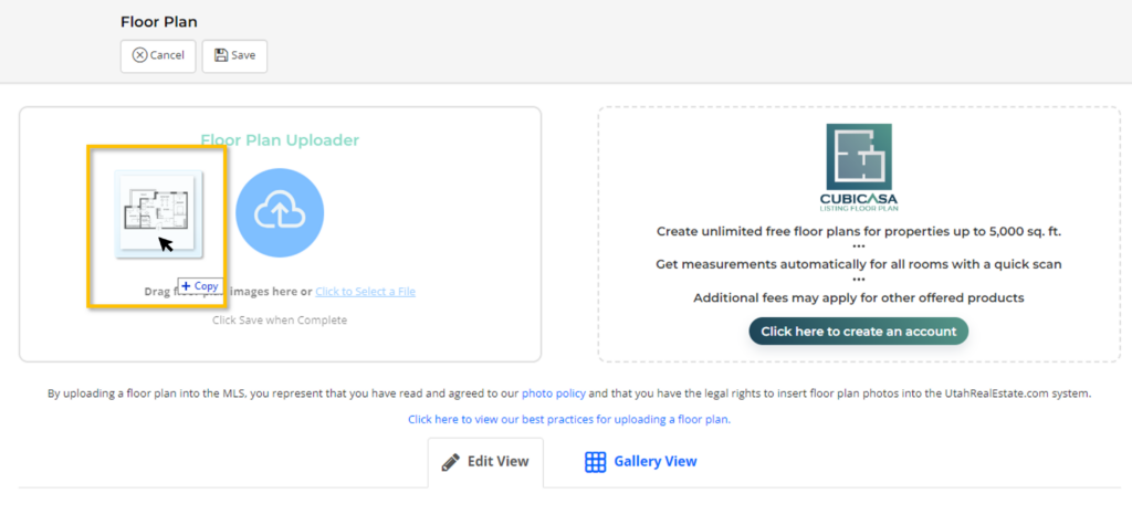 Any floor plan generated as a JPG/JPEG, PNG, or GIF file can be added to a listing using the Floor Plan uploader. We do not require the use of a certain floor plan company, however, we encourage the use of a company we have partnered with called CubiCasa.