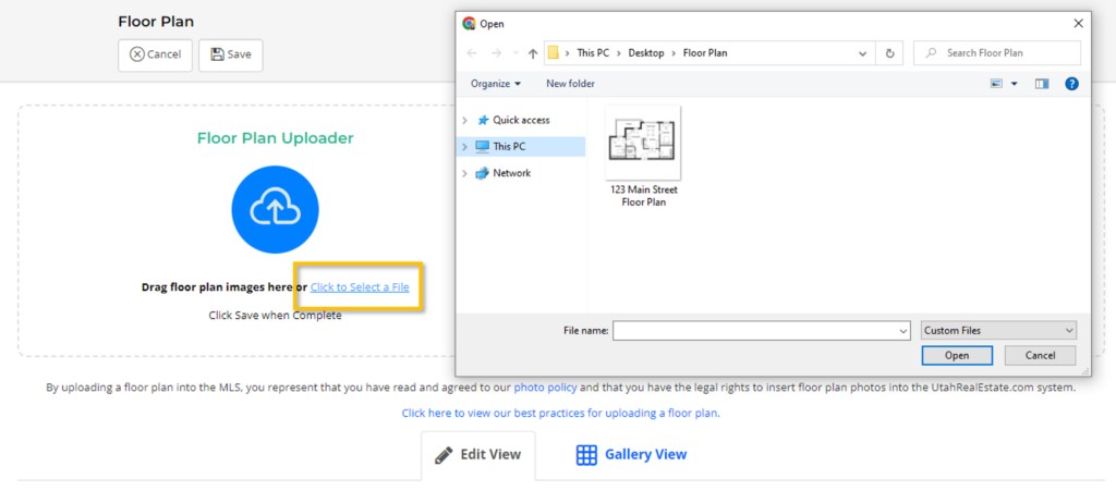 Alternatively, you can use the Select a File option in order to locate the floor plan file on your computer, as seen here: