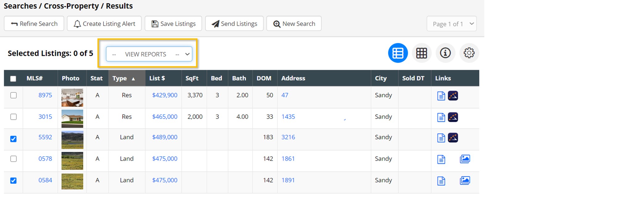 To view some or all search results in more detail, select the listings you want to learn more about and then open the dropdown labeled View Reports.