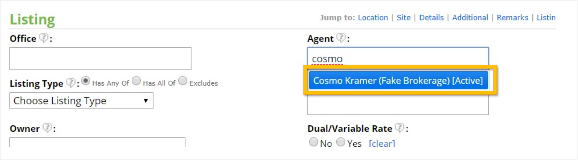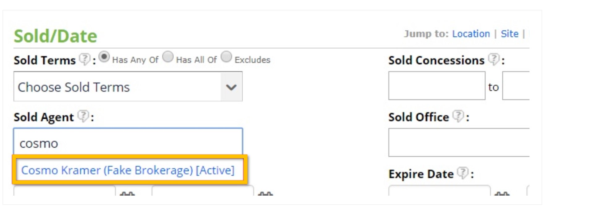 In the Agent field, type all or part of the agent’s name. Wait a moment, then select the agent and brokerage below. This will show all listings where that agent was the Listing Agent (represented the seller).