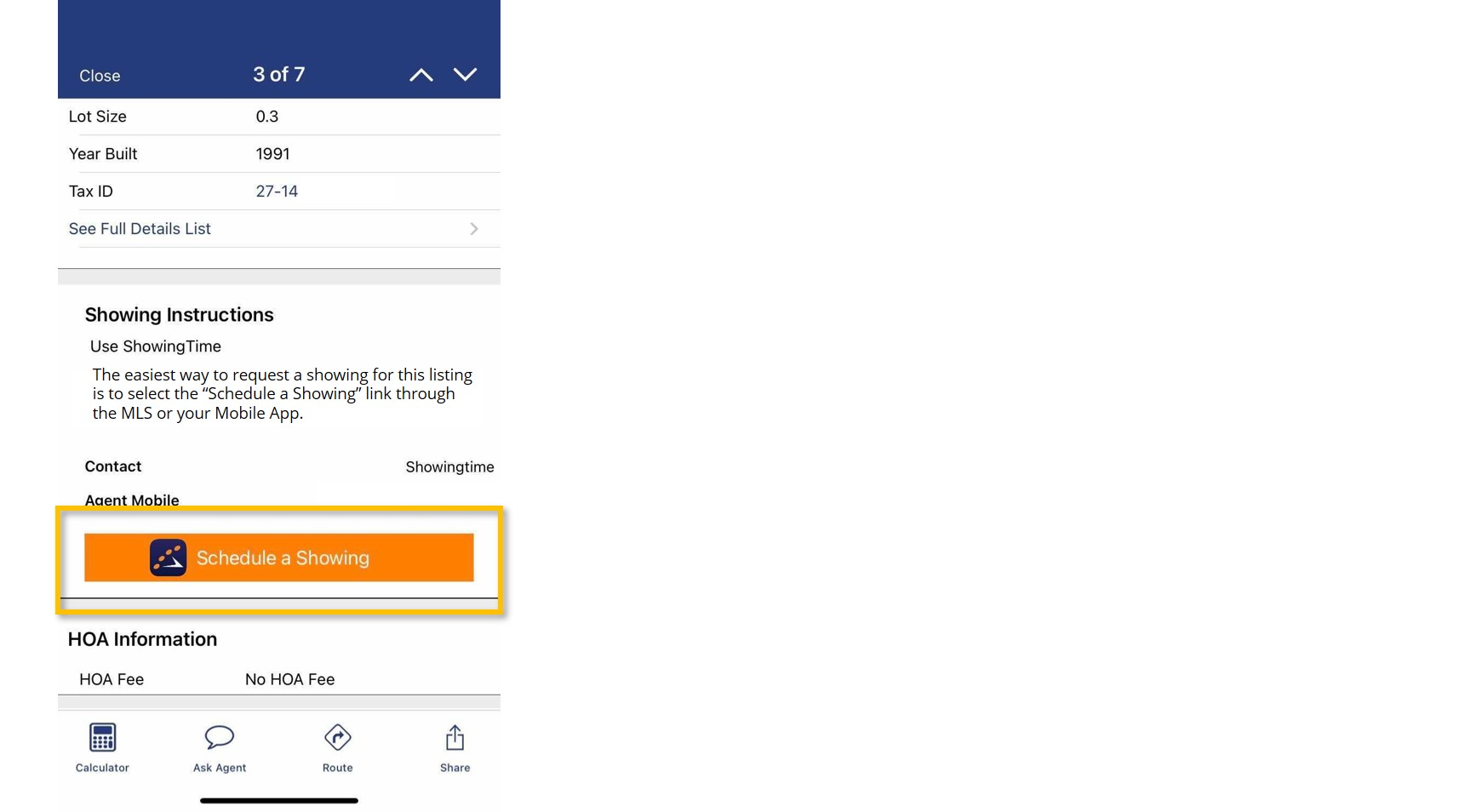 • Mobile Application: When viewing a listing in the mobile app, click the Schedule a Showing option that appears in the Showing Instructions section. Note: You must be logged in to the mobile app in order to see this option.